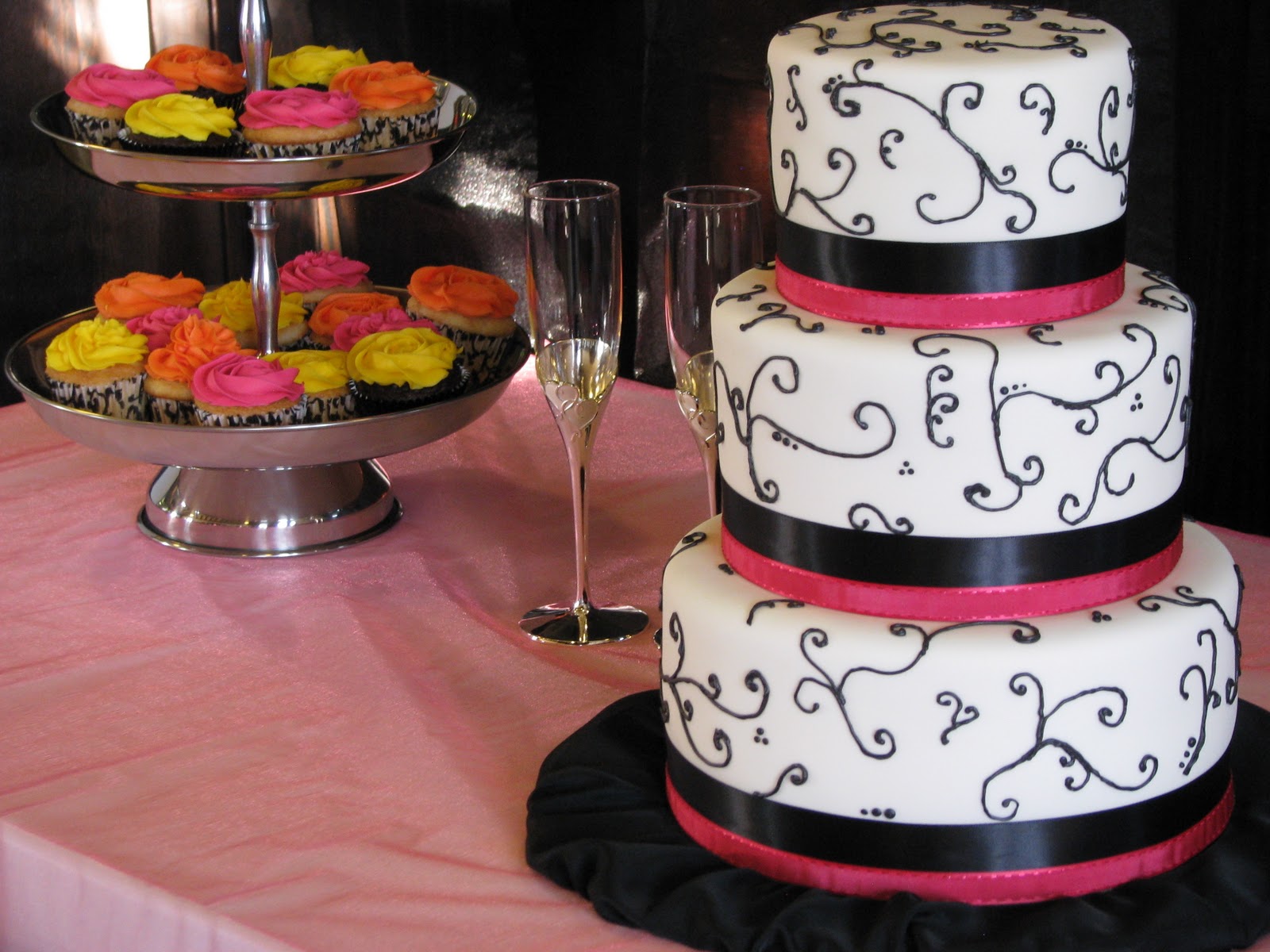 This scrolled wedding cake is three tall tiers of triple chocolate cake sandwiched with chocolate ganache buttercream, covered in fondant, hand piped, and wrapped in ribbon. The cupcakes are iced in vanilla buttercream to match the wedding colors. Congratulations to Billy and Nicole!